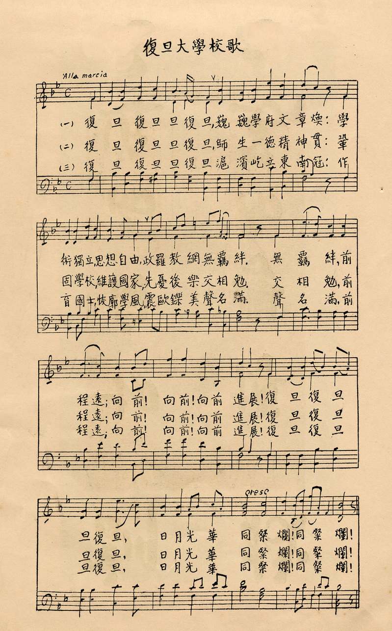 1905年,馬相伯創(chuàng)立復(fù)旦公學(xué),表示不忘“震旦”之舊,更含復(fù)興中華的意義?!皬?fù)旦”二字出自《尚書(shū)大傳》中的《虞夏傳·卿云歌》“卿云爛兮,糺縵縵兮。日月光華,旦復(fù)旦兮。”1951年,應(yīng)陳望道校長(zhǎng)之請(qǐng),毛澤東主席為復(fù)旦大學(xué)題寫(xiě)校名。復(fù)旦接到毛主席題名后,放大復(fù)制成校門(mén)匾額、縮小復(fù)制后用于校用信封、信箋、?;?、畢業(yè)證書(shū)封面等,一直沿用至今。(震旦學(xué)院是馬相伯于1902年創(chuàng)辦,開(kāi)學(xué)一年多之后,因法國(guó)教會(huì)勢(shì)力干預(yù)學(xué)校教務(wù),篡奪校政,師生憤然退學(xué))。 |