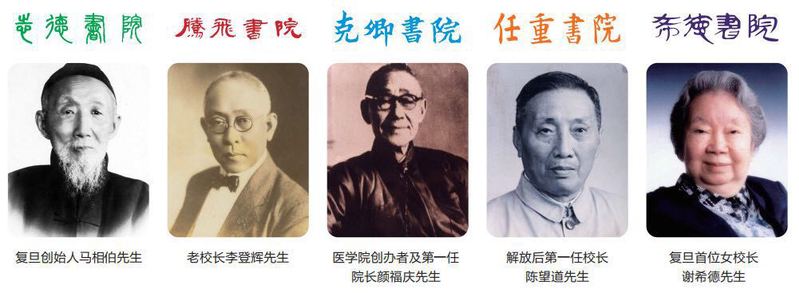 復(fù)旦大學(xué)目前有五個(gè)四年制住宿書(shū)院,分別以老校長(zhǎng)的名或字命名。志德書(shū)院,紀(jì)念復(fù)旦創(chuàng)始人馬相伯(原名志德)先生,院服、院旗以綠色為標(biāo)志性顏色;騰飛書(shū)院,紀(jì)念老校長(zhǎng)李登輝(字騰飛)先生,以紅色為標(biāo)志色;克卿書(shū)院,紀(jì)念上海醫(yī)學(xué)院創(chuàng)辦者顏福慶(字克卿)先生,以藍(lán)色為標(biāo)志色;任重書(shū)院,紀(jì)念解放后第一任校長(zhǎng)陳望道(字任重)先生,以橙色為標(biāo)志色;希德書(shū)院,紀(jì)念復(fù)旦歷史上的首位女校長(zhǎng)謝希德先生,以紫色為標(biāo)志色。